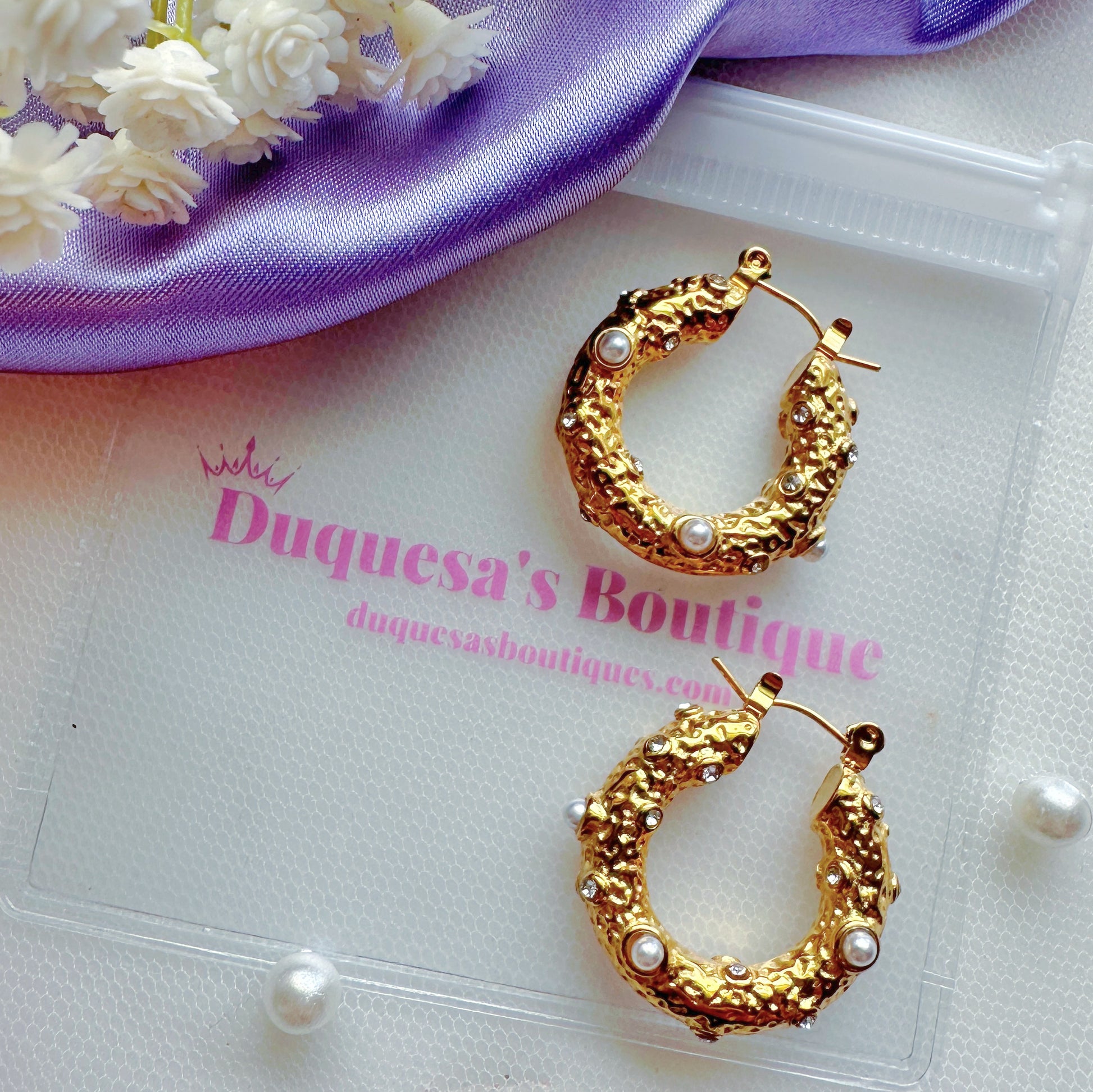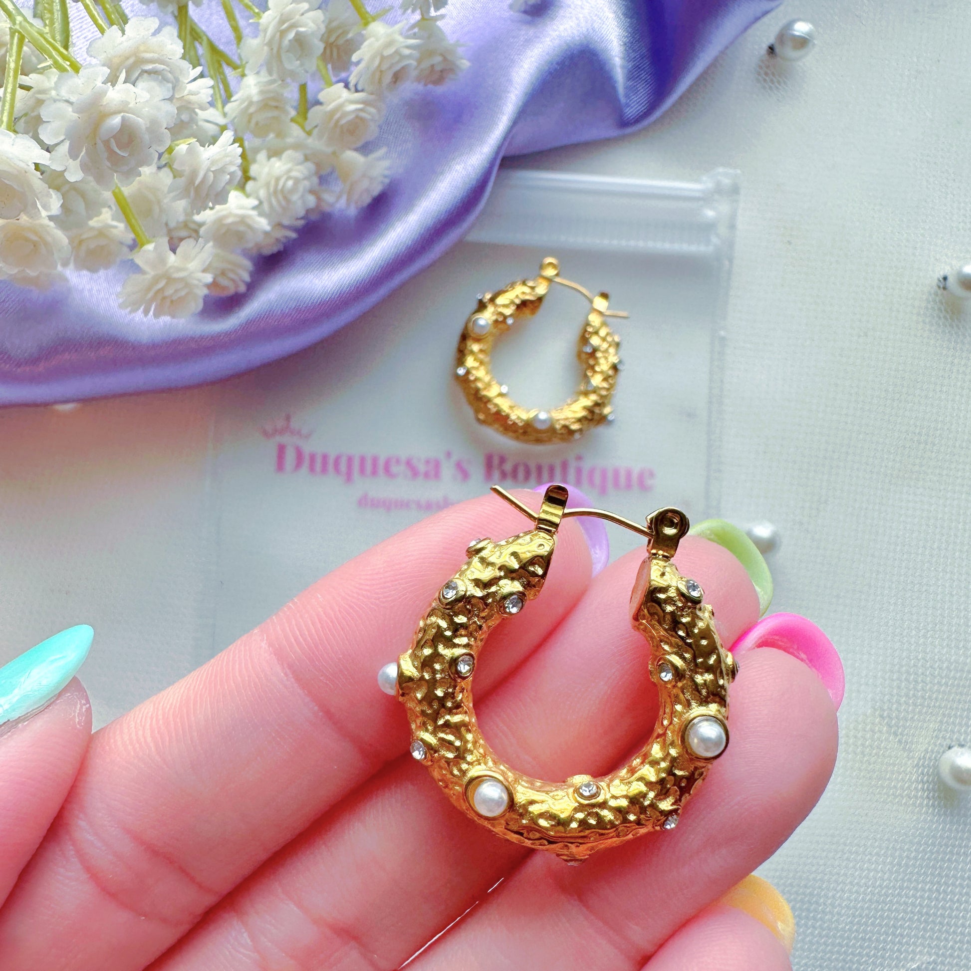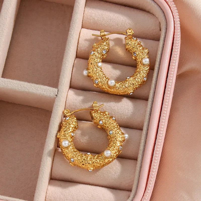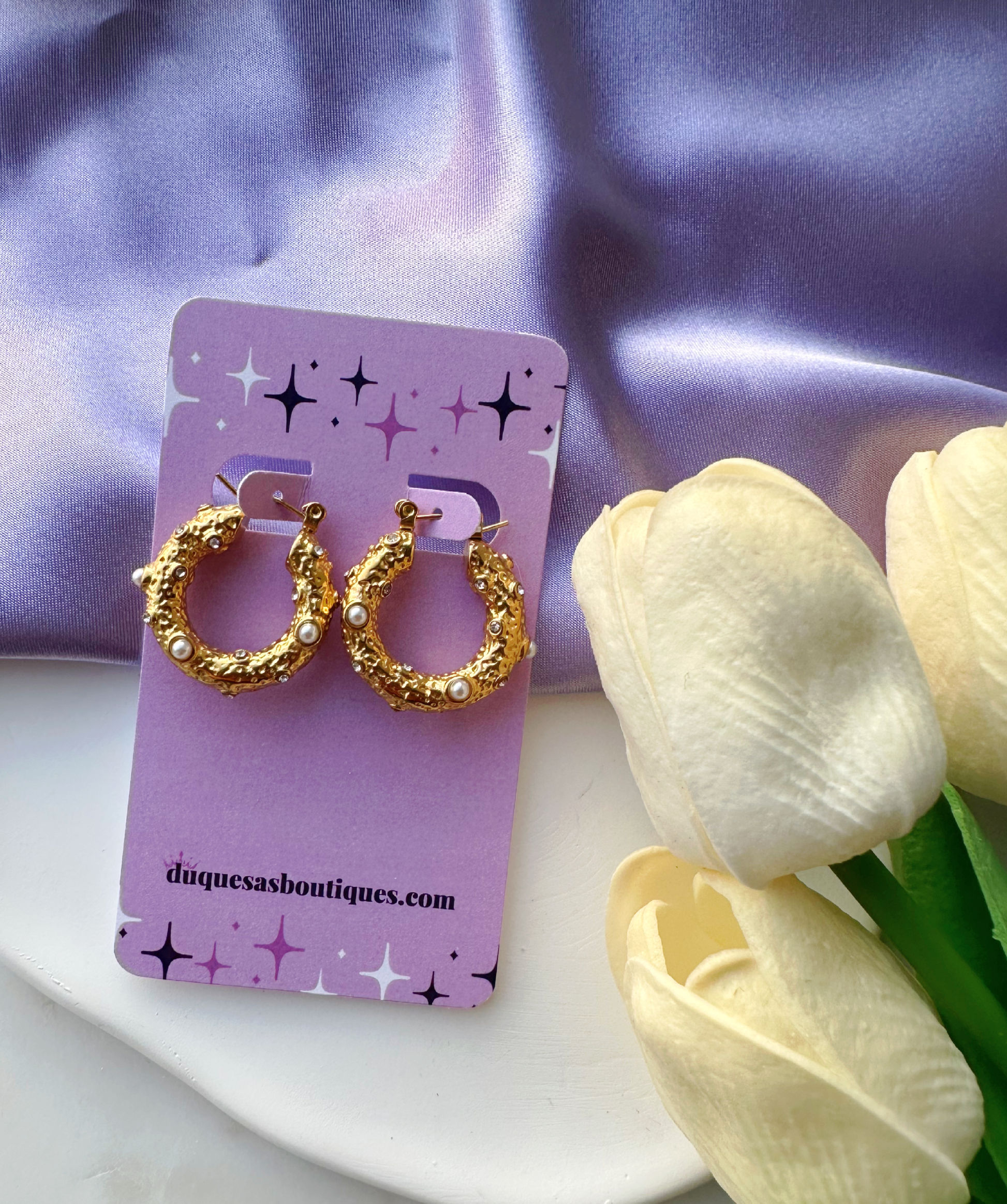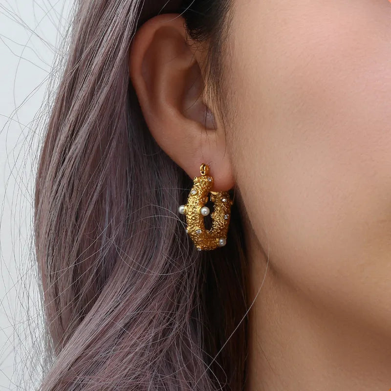 These gorgeous hoop earrings are made from stainless steel and 18k gold plated. Decorated with pearls and clear zircon. They will make you feel and look like a real duchess.