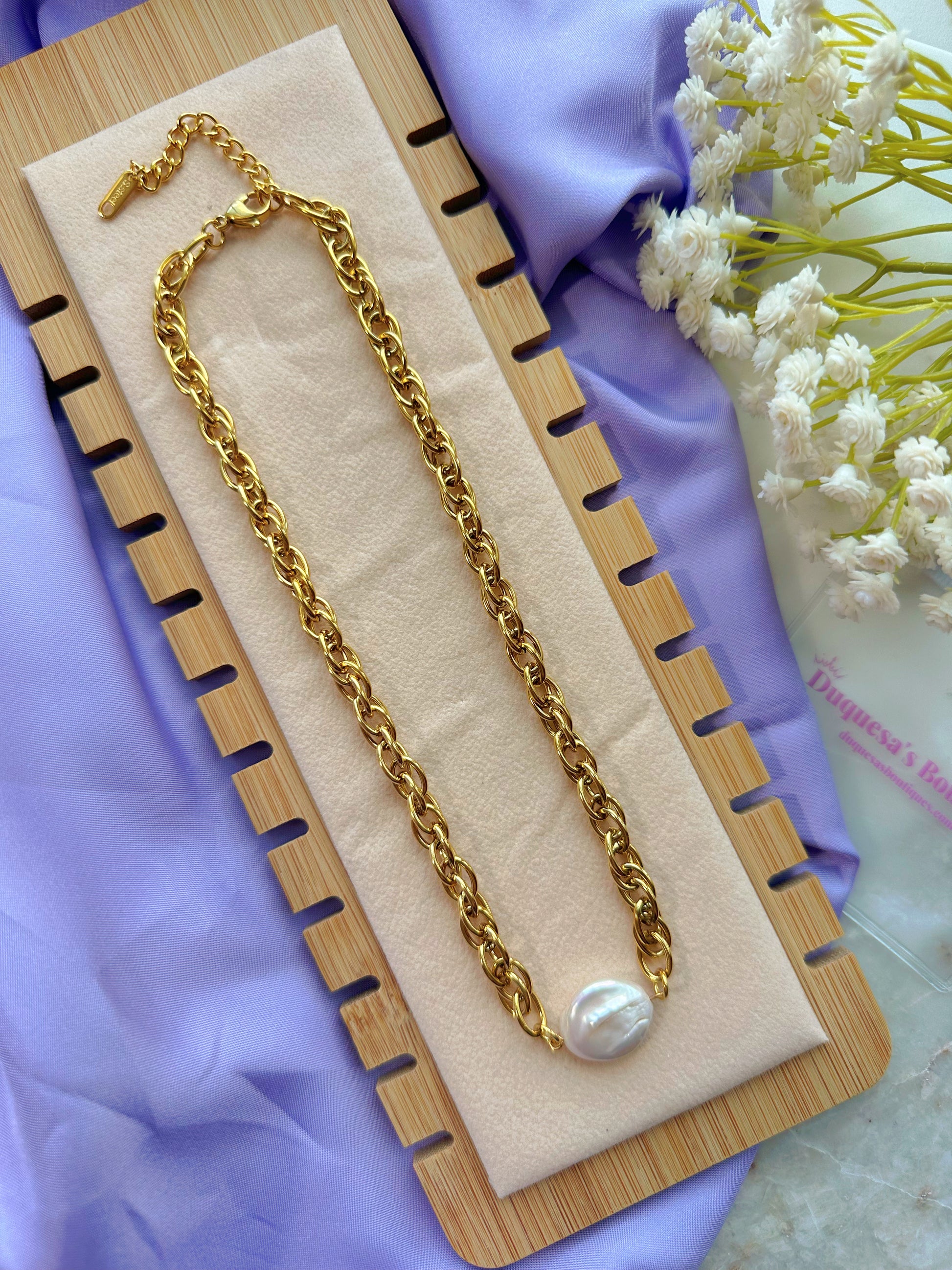 This beautiful choker necklace is made from Stainless Steel and 14k gold plaited link adjustable chain decorated with a big pearl in the center.