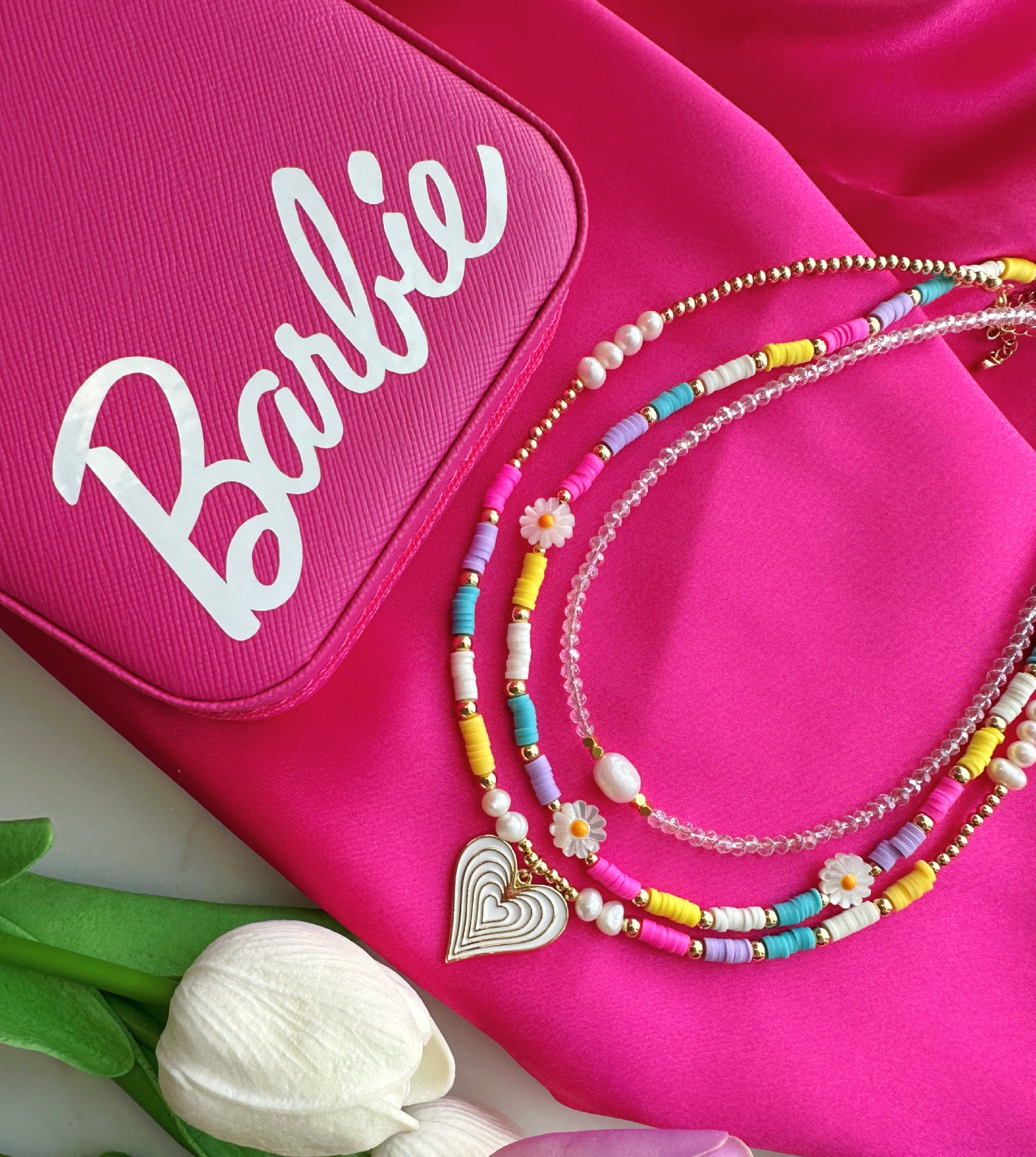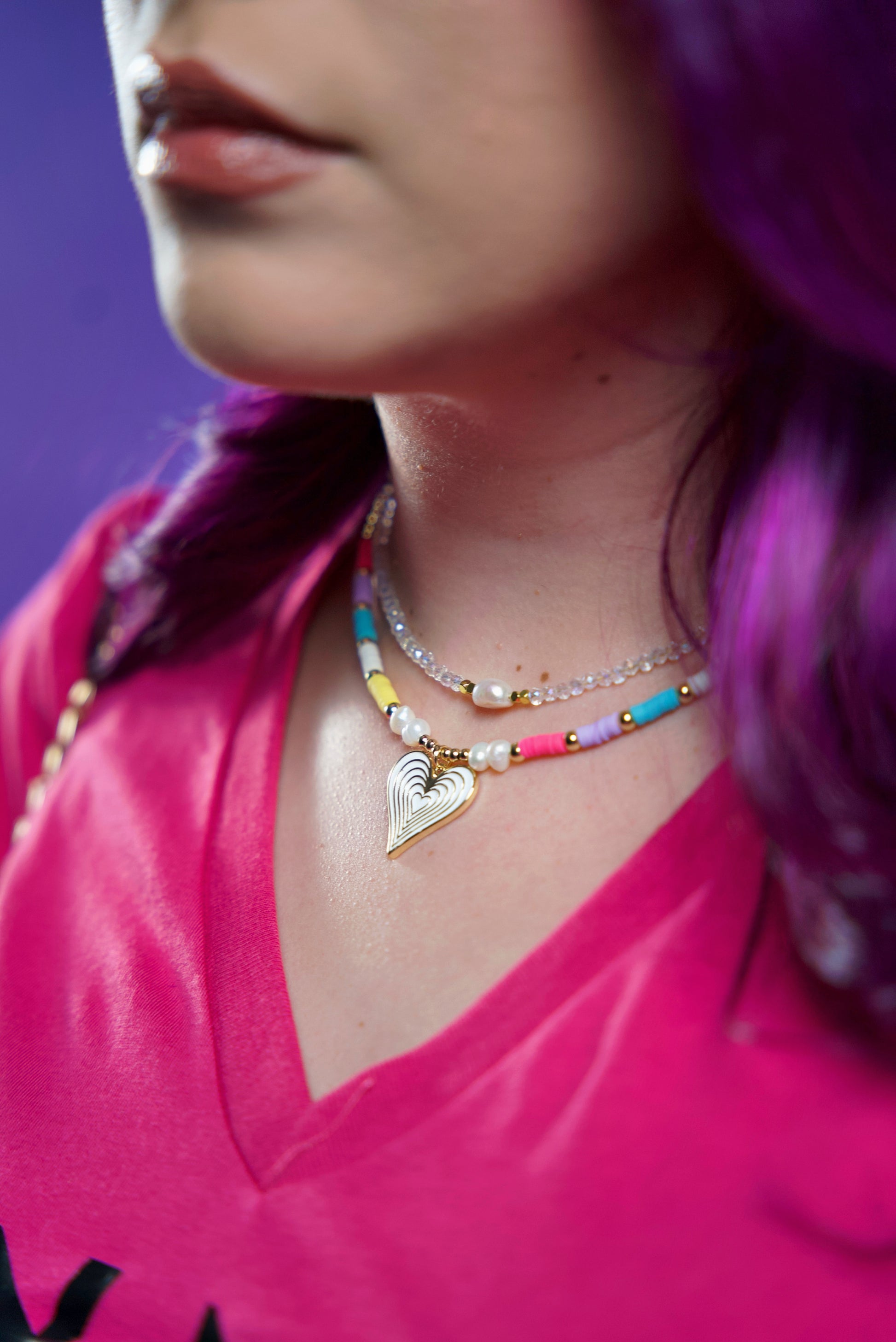 This beautiful necklace is made from Stainless Steel and 14k gold plaited beads, sweet water pearls, multicolored soft clay beads and a white hear charm in the middle.