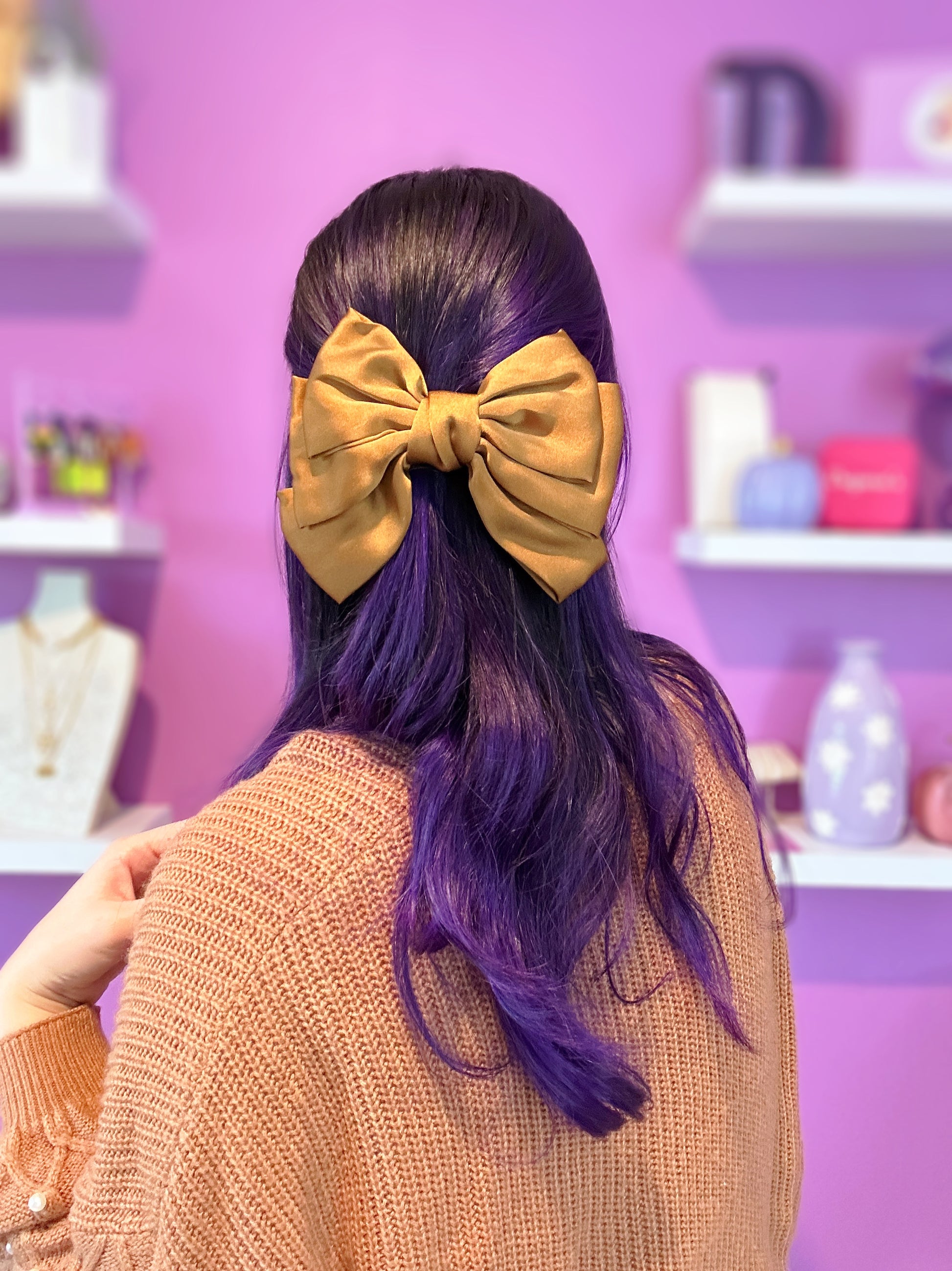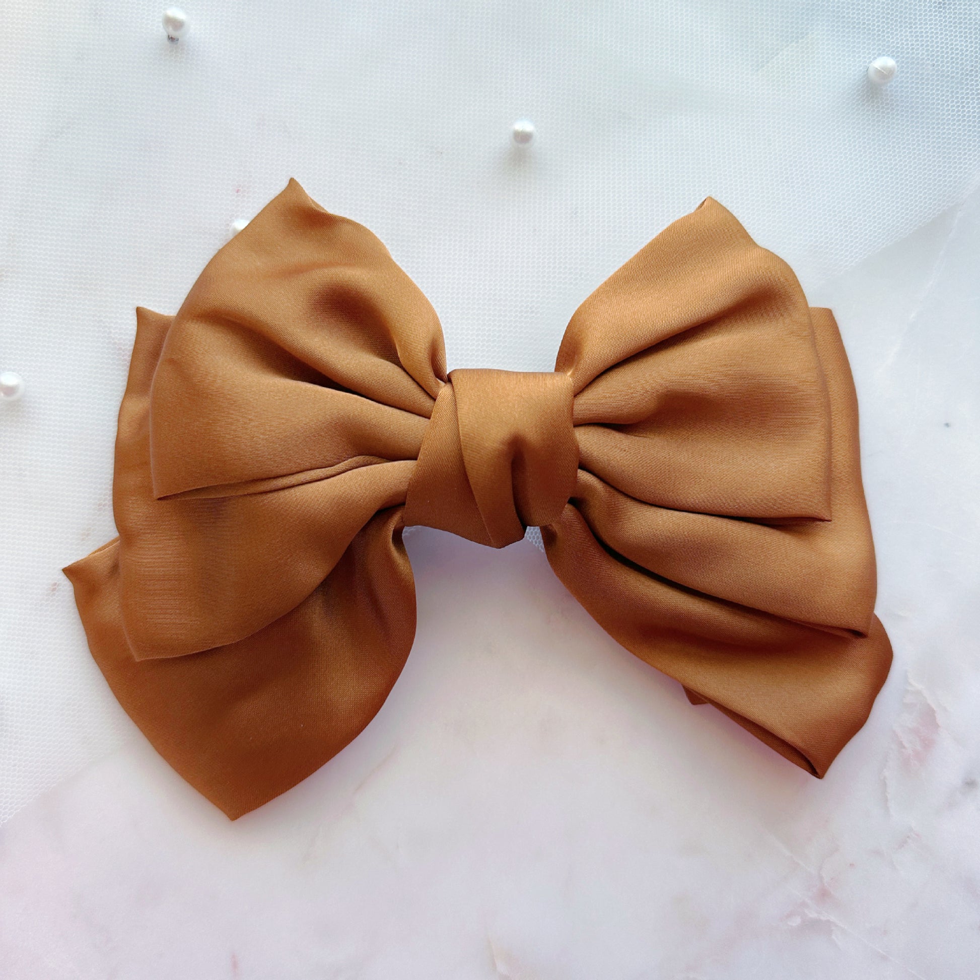 Simple deep mustard tone fabric handmade double bow knot hair clip.