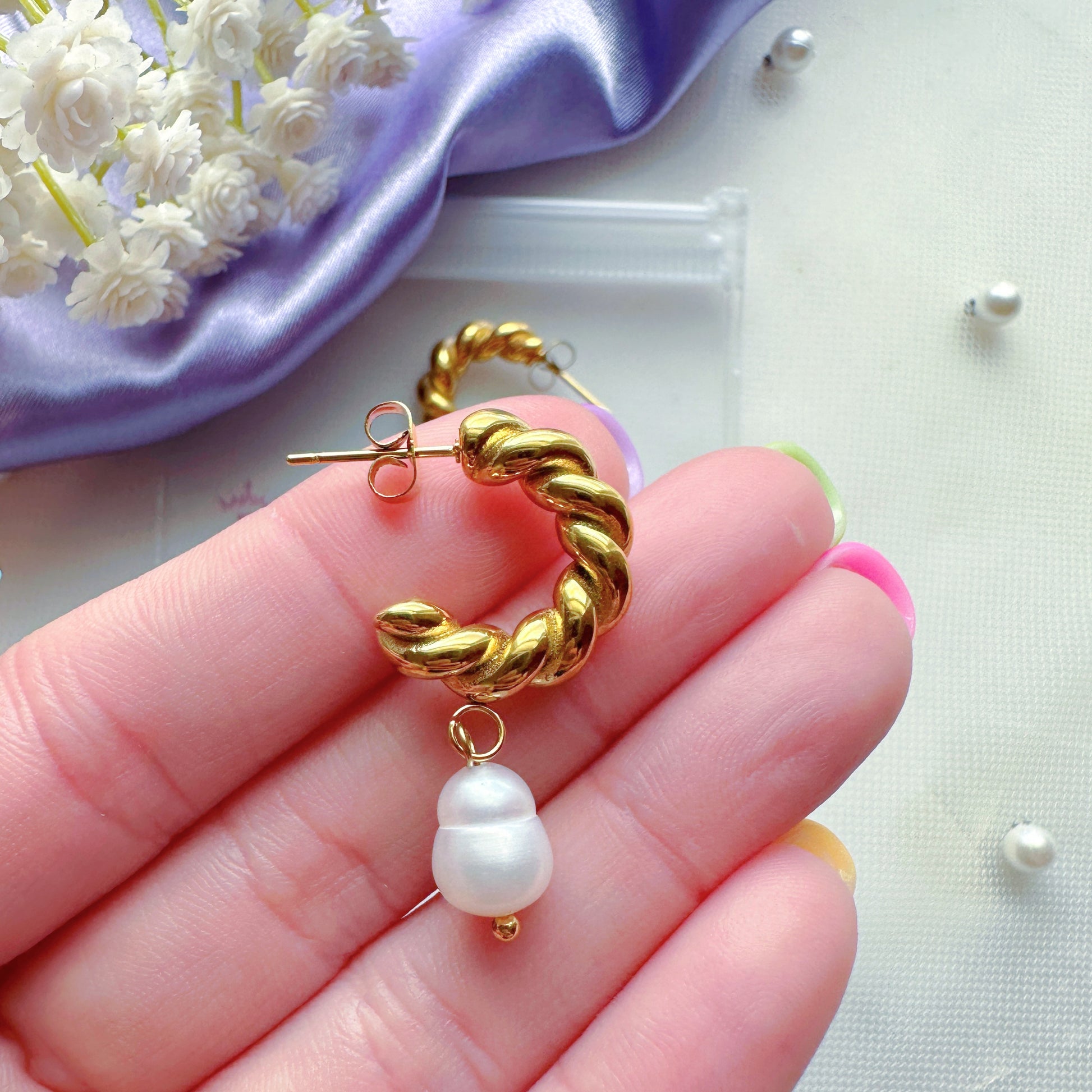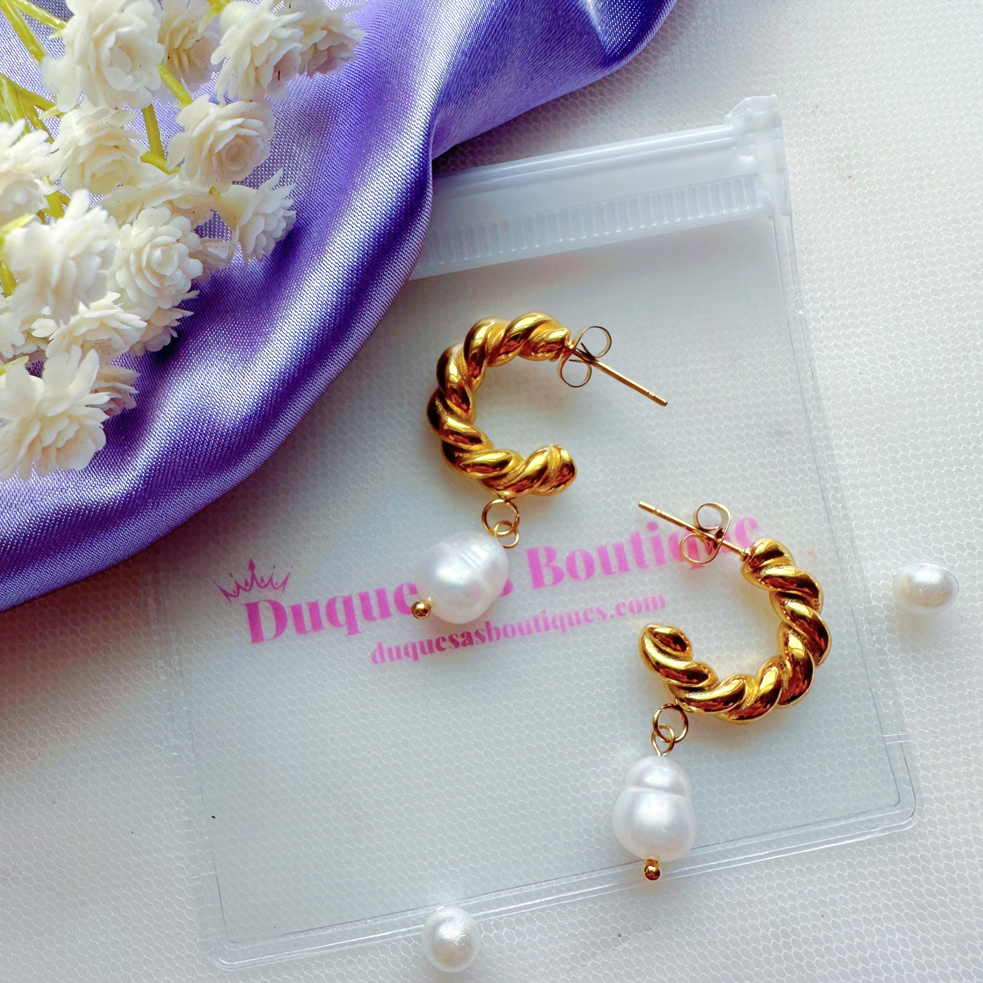 These gorgeous hoop earrings are made from stainless steel and 18k gold plated. Decorated with pearls and clear zircon. They will make you feel and look like a real duchess.