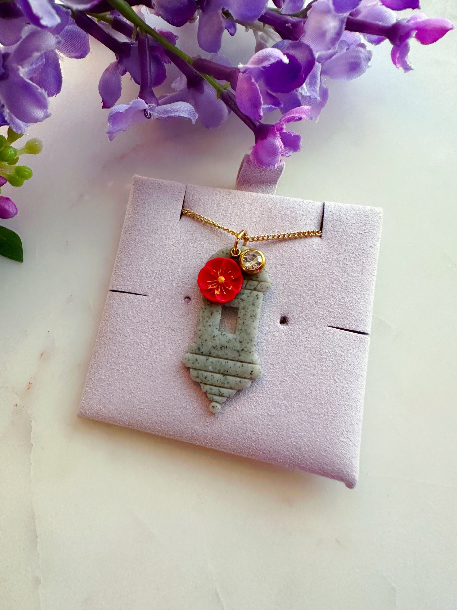 Este collar está compuesto por una cadena de stainless steel con baño en oro, acompañada de un charm artesanal hecho a mano en arcilla de polímero. La figura representa una garita del Morro, ícono histórico de nuestra isla, decorada con una flor roja tropical y un detalle brillante que le da ese toque especial y coqueto.