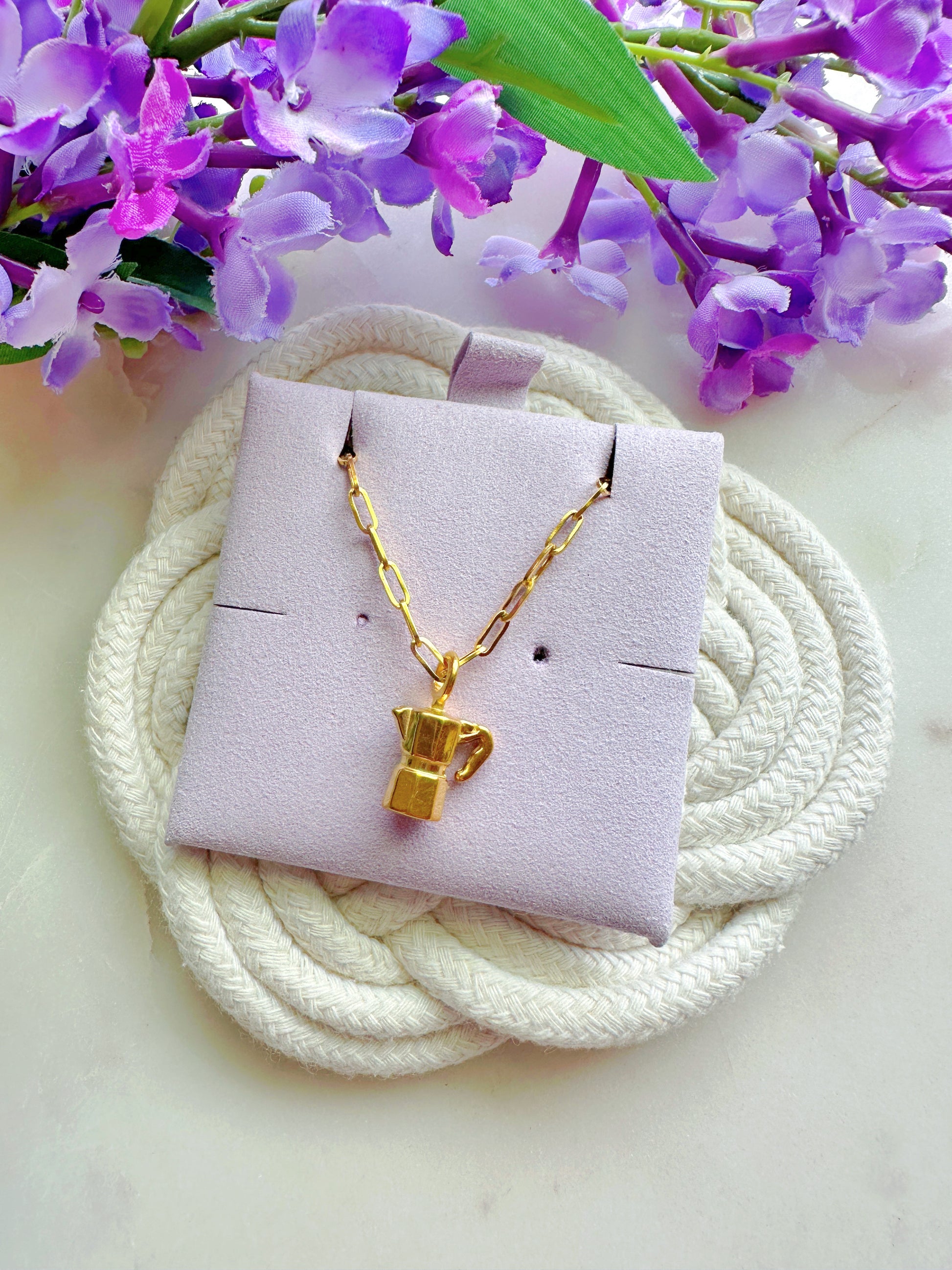 Un accesorio cargado de tradición y recuerdos. Esta cadena en stainless steel con baño en oro lleva como charm una greca cafetera, ese símbolo tan nuestro que nos transporta directo a la cocina de la abuela.