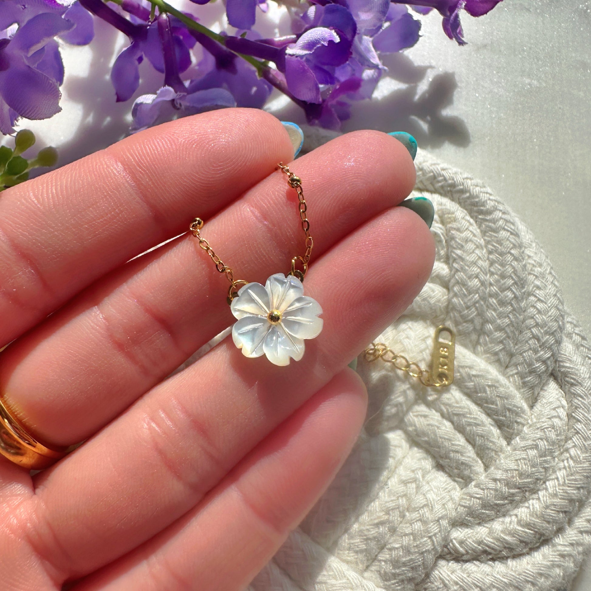 Reina del Alba Necklace está inspirada en el amanecer caribeño, ese instante en el que la luz nace suave pero segura. Su flor blanca de nácar simboliza pureza, nuevos comienzos y la energía femenina en su forma más serena.